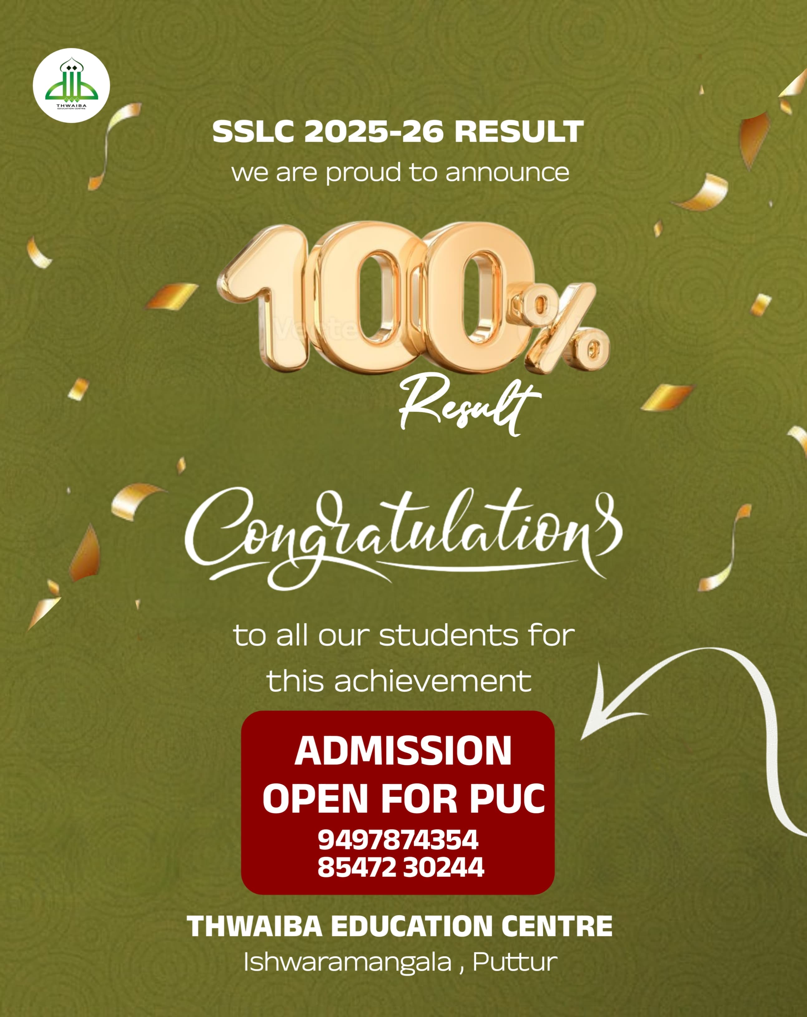 ಈಶ್ವರಮಂಗಲ: ಗುಣಮಟ್ಟದ ಶಿಕ್ಷಣ ಮತ್ತು ಶಿಸ್ತಿಗೆ ಹೆಸರಾದ ಇಲ್ಲಿನ ಪ್ರತಿಷ್ಠಿತ ತ್ವೈಬಾ ವಿದ್ಯಾಸಂಸ್ಥೆಯು 2026ನೇ ಸಾಲಿನ ಎಸ್ಸೆಸ್ಸೆಲ್ಸಿ ಪರೀಕ್ಷೆಯಲ್ಲಿ ನೂರಕ್ಕೆ ನೂರು ಫಲಿತಾಂಶವನ್ನು ಪಡೆಯುವ ಮೂಲಕ ವಲಯದ ಶೈಕ್ಷಣಿಕ ಕ್ಷೇತ್ರದಲ್ಲಿ ಹೊಸ ಮೈಲಿಗಲ್ಲು ಸ್ಥಾಪಿಸಿದೆ. ಧಾರ್ಮಿಕ ಮತ್ತು ಲೌಕಿಕ ಶಿಕ್ಷಣದ ವಿಶಿಷ್ಟ ಸಮನ್ವಯದೊಂದಿಗೆ ಕಾರ್ಯನಿರ್ವಹಿಸುತ್ತಿರುವ ಈ ಸಂಸ್ಥೆಯು ತನ್ನ ಸಾಧನೆಯ ಪರಂಪರೆಯನ್ನು ಈ ಬಾರಿಯೂ ಮುಂದುವರಿಸಿದೆ.