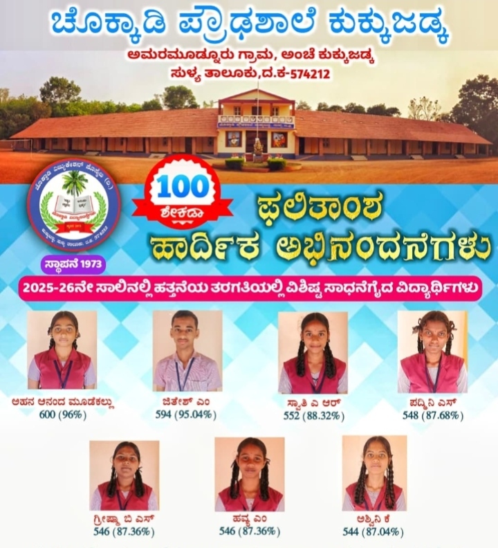 ಸುಳ್ಯ ತಾಲೂಕಿನ ಕುಕ್ಕುಜಡ್ಕದ ಚೊಕ್ಕಾಡಿ ಪ್ರೌಢಶಾಲೆಯು 2025-26ನೇ ಸಾಲಿನ ಎಸ್ಎಸ್ಎಲ್ಸಿ ಪರೀಕ್ಷೆಯಲ್ಲಿ ಶೇಕಡಾ 100ರಷ್ಟು ಫಲಿತಾಂಶ ದಾಖಲಿಸಿ ಅಭೂತಪೂರ್ವ ಸಾಧನೆ ಮಾಡಿದೆ. ಅಮರಮುಡ್ನೂರು ಗ್ರಾಮದ ಈ ಶಾಲೆಯು ತನ್ನ ಶೈಕ್ಷಣಿಕ ಗುಣಮಟ್ಟವನ್ನು ಮತ್ತೊಮ್ಮೆ ಸಾಬೀತುಪಡಿಸಿದೆ.